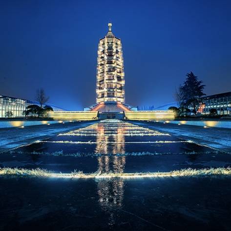 简介:整体景区包括九大景观,即千年佛光、遗址奇观、舍利地宫、大报恩塔、圣迹博览、实景演出、江南首寺、报恩讲坛、明街明风等。 报恩新塔位于明代大报恩寺琉璃塔的原址之上,既传承历史记忆又起到保护地宫的作用。为避免对遗址的扰动,采用四组钢管斜梁跨越遗址上方,地梁落脚点位于整个塔基遗址的外侧,形成"覆钵型"新的地宫,在原有地宫遗址上营造新的圣物奉安与瞻礼空间。 基于文物保护最小干扰与可识别原则,新塔不允许采用古塔复原形式,新塔采用先进的钢结构和超白玻璃等轻质材料。夜晚大报恩塔利用智能控制LED及远射投影,再现梦幻般的琉璃佛光。新塔高度93.157米,平面轮廓与古塔八边形平面吻合,内核由两个正方形旋转交错构成莲花瓣状,寓含花漫菩提,通过层层收分、塔顶重构等加强对古塔形式呼应,以当代技术再造新塔古韵。 游客进塔,可先看安奉感应舍利的舍利地宫,随后乘坐电梯至九层进入云中佛殿,纵览江南烟雨,一饱金陵风韵。